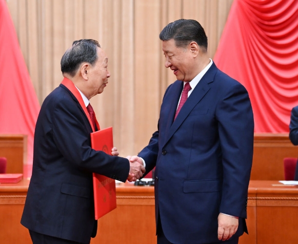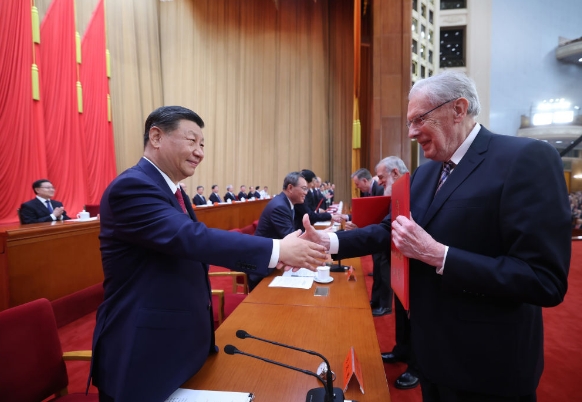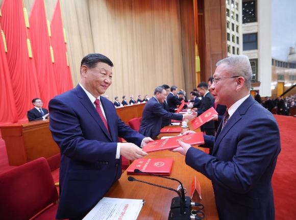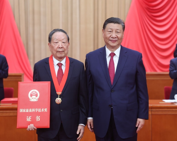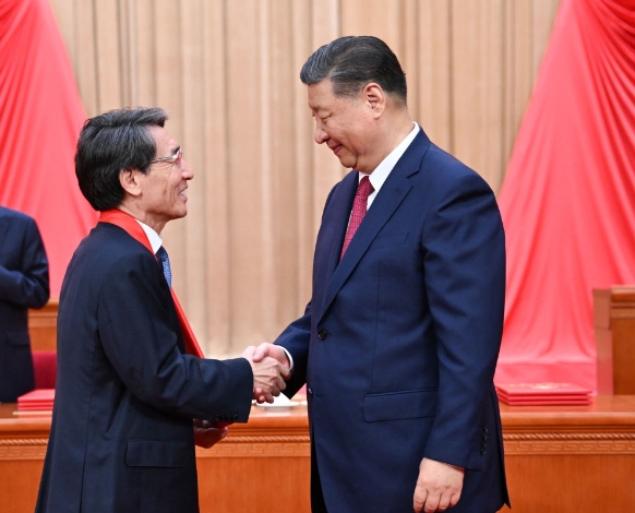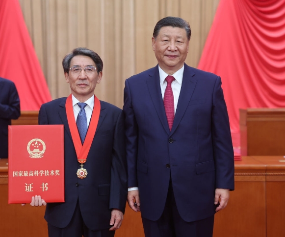 6月24日,全国科技大会、国家科学技术奖励大会和中国科学院第二十一次院士大会、中国工程院第十七次院士大会在北京人民大会堂隆重召开。中共中央总书记、国家主席、中央军委主席习近平向获得2023年度国家最高科学技术奖的清华大学薛其坤院士颁奖。新华社记者 谢环驰 摄