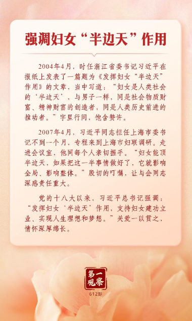 习近平总书记始终心系妇女事业发展。在全球妇女峰会即将召开之际,让我们一道深刻体悟这份一以贯之的牵挂与重视。