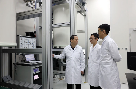 2025年3月3日,中国科学技术大学教授、“祖冲之号”量子计算总师朱晓波(左一)与学生讨论实验结果。新华社发(代蕊摄)