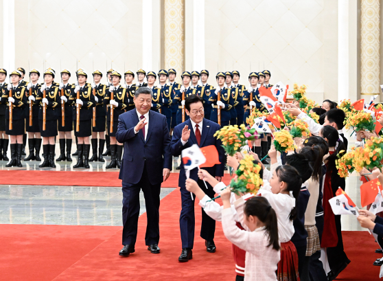1月5日下午,国家主席习近平在北京人民大会堂同来华进行国事访问的韩国总统李在明举行会谈。这是会谈前,习近平在人民大会堂北大厅为李在明举行欢迎仪式。新华社记者 翟健岚 摄