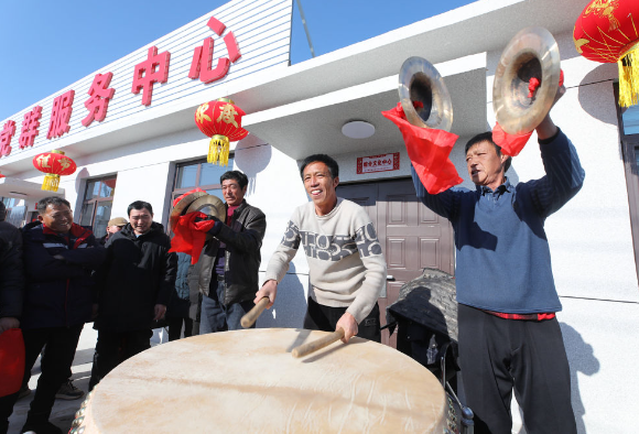 2025年1月28日,辽宁省葫芦岛市绥中县明水满族乡祝家沟村村民在重建新房的村党群服务中心前鸣锣击鼓。新华社发(田嘉 摄)