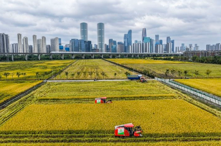 2025年10月21日,收割机在浙江省杭州市萧山区世纪田园粮食功能区的稻田里收割水稻,远处高铁列车飞驰而过(无人机照片)。新华社记者 徐昱 摄