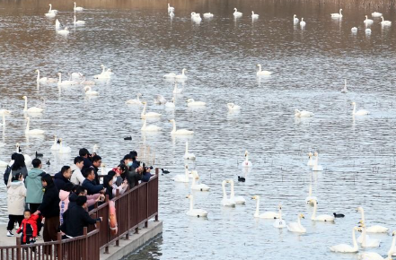 2025年12月20日,游人在河南省三门峡市天鹅湖国家城市湿地公园观赏天鹅。新华社发(牛书培 摄)