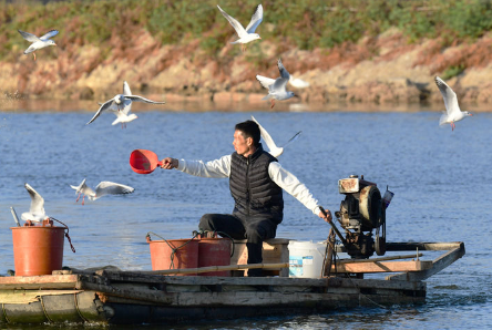 2025年12月10日,福建省漳州市佛昙镇东坂村河豚养殖户在给河豚投喂食物。新华社记者 魏培全 摄