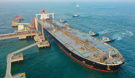 2025年12月18日,一艘装载着石化原辅料的外籍船舶泊入位于海南省儋州市的国投洋浦油储码头30万吨级原油泊位(无人机照片)。自2025年12月18日起,海南自由贸易港正式启动全岛封关。新华社记者 郭程 摄