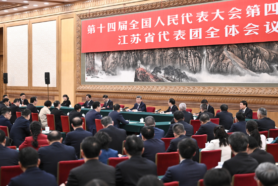 3月5日下午,中共中央总书记、国家主席、中央军委主席习近平参加他所在的十四届全国人大四次会议江苏代表团审议。新华社发(盛佳鹏摄)