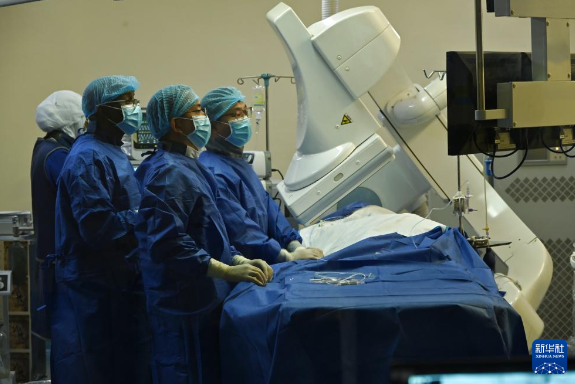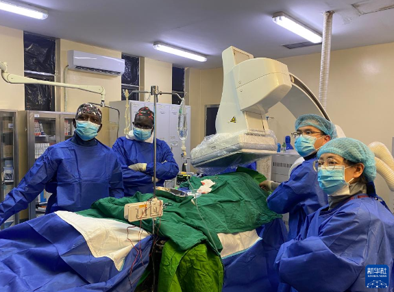 11月18日,在尼日尔尼亚美,广西壮族自治区人民医院心血管内科专家组为患者开展永久心脏起搏器植入术。新华社发(第24批援尼日尔中国医疗队供图)