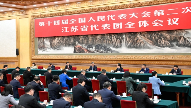 3月5日,中共中央总书记、国家主席、中央军委主席习近平参加他所在的十四届全国人大二次会议江苏代表团审议。新华社记者 鞠鹏 摄