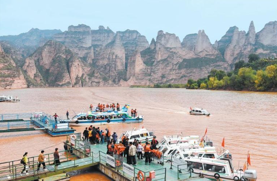游客乘船在永靖县炳灵寺5A级景区游览。(通讯员史有东)
