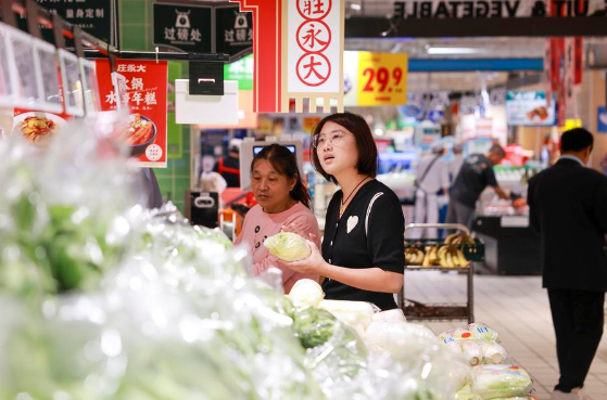 15 октября 2025 года, покупатели выбирают овощи в одном из супермаркетов города Тайсин в провинции Цзянсу /Восточный Китай/. /Фото: Синьхуа/
