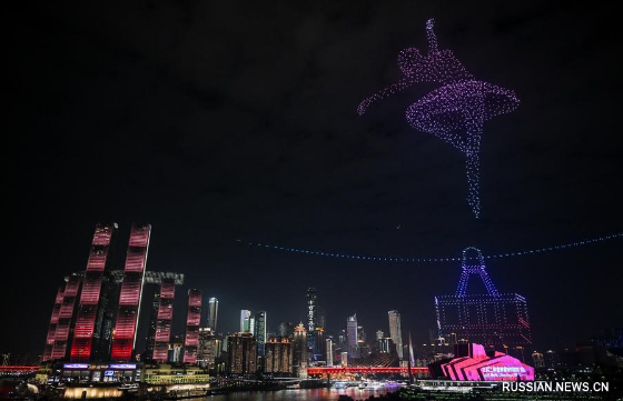 27 октября 2025 года, на снимке запечатлено световое шоу дронов в районе Наньань города Чунцин на юго-западе Китая. /Фото: Синьхуа/