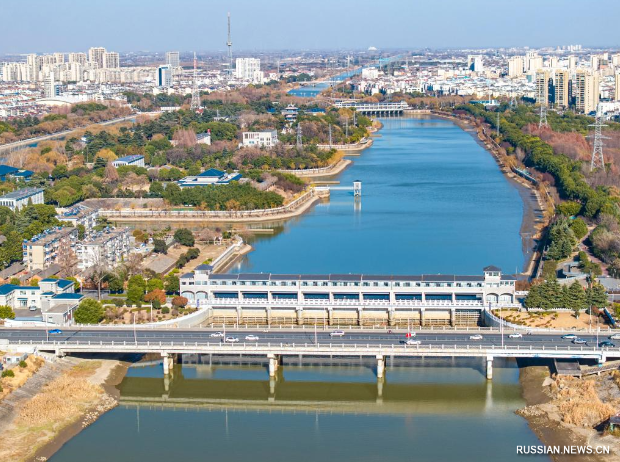 На фотографии, сделанной дроном с высоты птичьего полета, запечатлен гидроузел Цзянду в одноименном районе города Янчжоу провинции Цзянсу на востоке Китая, расположенный в начале восточного маршрута китайского мегапроекта.