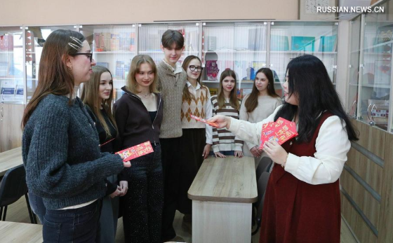 2 февраля, Минск. Предподавательница факультета китайского языка и культуры Белорусского государственного университета иностранных языков Жэнь И /первая справа/ знакомит студентов с традицией "хунбао" /красные конверты с деньгами, которые принято дарить в Китае на праздник Весны/. /Фото: Синьхуа/