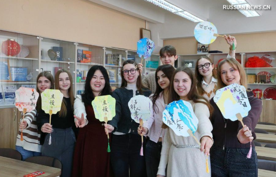 2 февраля, Минск. Студенты факультета китайского языка и культуры Белорусского государственного университета иностранных языков знакомятся с китайской росписью вееров. /Фото: Синьхуа/
