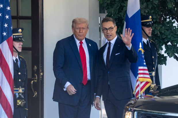 9 октября, Вашингтон. Президент США Дональд Трамп /второй слева/ приветствует президента Финляндии Александра Стубба /второй справа/ в Белом доме. /Фото: Синьхуа/