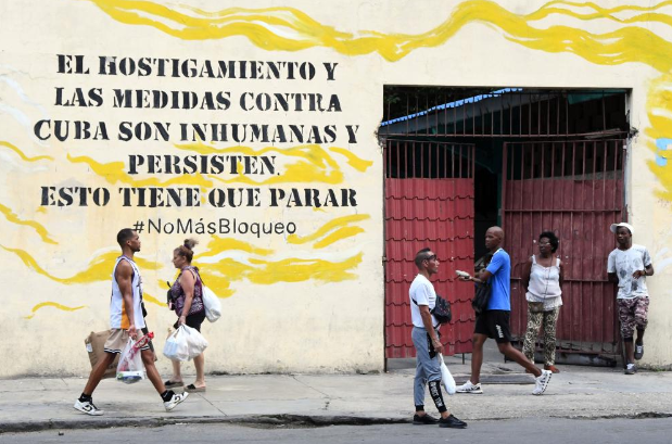 Гавана, 22 сентября. Пешеходы проходят мимо настенной росписи, осуждающей экономическую блокаду США против Кубы. /Фото: Синьхуа/
