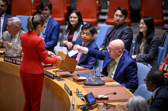 12 ноября, Нью-Йорк. Сотрудница зала заседаний /женщина в красном/ собирает бюллетени во время заседания Совета Безопасности по выборам судьи Международного суда ООН в штаб-квартире всемирной организации. /Фото: ООН/Синьхуа/