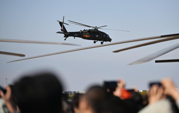 18 октября 2025 года, китайские вертолеты Чжи-20 /Z-20/ выполняют демонстрационные полеты на 7-й Китайской международной выставке вертолетов в городе Тяньцзинь на севере Китая. /Фото: Синьхуа/