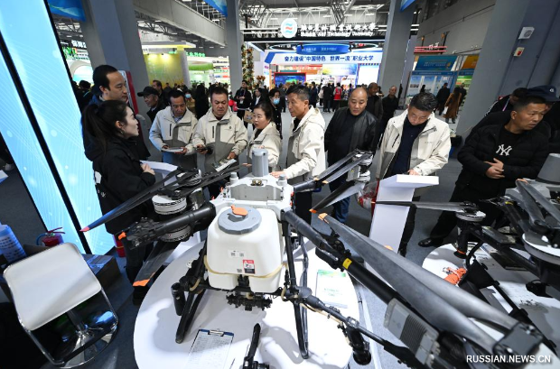 25 октября 2025 года, посетители знакомятся с агродронами на 32-й Китайской /Янлинской/ ярмарке высокотехнологичных достижений в сфере сельского хозяйства в провинции Шэньси /Северо-Западный Китай/. /Фото: Синьхуа/