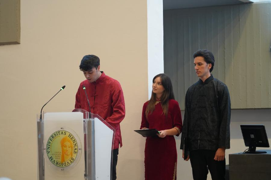 На церемонии открытия в понедельник итальянские студенты на двух языках прочитали отрывки из "Учения о середине", которые перекликаются с идеями, что П. Инторчетта когда-то представил Европе в своем шедевре "Китайская мудрость".