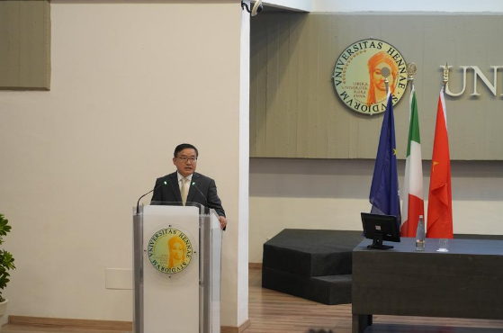 11 ноября, Энна, Италия. Посол Китая в Италии Цзя Гуйдэ выступает с речью на церемонии открытия серии мероприятий, посвященных 400-летию со дня рождения Просперо Инторчетты, в Университете Коре. /Фото: Синьхуа/