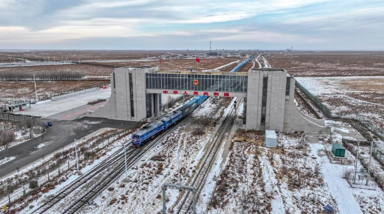 На снимке от 22 декабря 2025 года запечатлен грузовой поезд Китай-Европа, въезжающий на территорию Китая через ж/д КПП Эрэн-Хото. /Фото: Синьхуа/