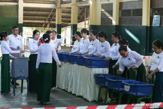 25 января, Янгон, Мьянма. Сотрудники Союзной избирательной комиссии подсчитывают распечатанные протоколы голосования в ходе третьего этапа всеобщих выборов на избирательном участке в Янгоне. /Фото: Синьхуа/