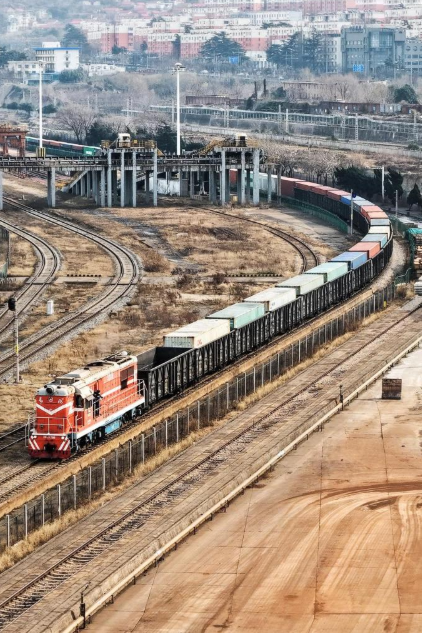 1 января 2026 года, груженный автозапчастями поезд покидает Базу китайско-казахстанского логистического сотрудничества, расположенную в городе Ляньюньган провинции Цзянсу. /Фото: Синьхуа/
