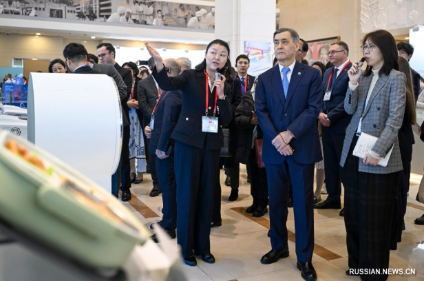 Перед началом церемонии открытия данного центра заместитель директора Медицинского колледжа Шанхайского университета "Цзяотун" Би Юйфан /слева на переднем плане/ познакомила генерального секретаря ШОС Нурлана Ермекбаева /в середине на переднем плане/ с результатами медицинских исследований в соответствующей сфере.