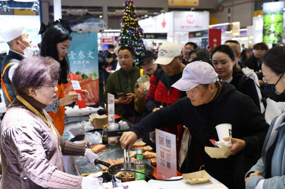 19 декабря 2025 года, посетители ярмарки "U-Fair" на полях Китайского международного импортного ЭКСПО /CIIE/ в г. Шанхай пробуют лосось из Чили. /Фото: Синьхуа/