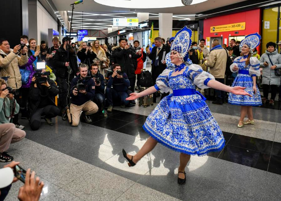 24 февраля 2023 года, в московском аэропорту Шереметьево проходит церемония встречи первой прибывшей в Россию группы китайских туристов с момента возобновления выездного туризма из Китая после пандемии COVID-19. /Фото: Синьхуа/