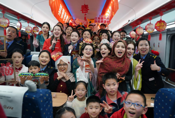 10 февраля 2026 года, общее фото с проводниками поезда, иностранными студентами и пассажирами. /Фото: Синьхуа/