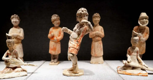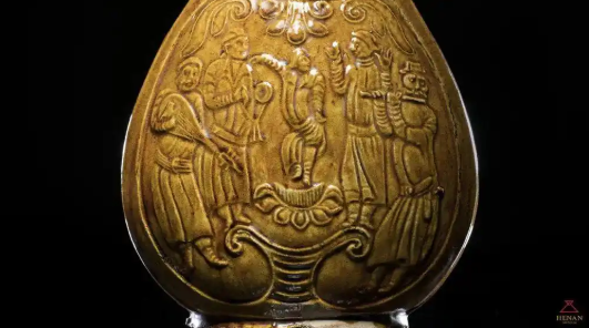 Желтый глазурованный плоский кувшин эпохи Северной Ци (550 – 577 гг.) из коллекции Хэнаньского музея — это культурное сокровище, хранящее память о Шелковом пути. Форма керамического изделия напоминает форму седельной сумки, которую носили кочевые народы верхом на лошадях, а обе стороны горшка украшены яркими узорами «Танца Хутэна»: танцоры прыгают и танцуют на лотосовых тронах, а музыканты по обе стороны играют на флейтах, тарелках и пипе. Эта сцена ярко воссоздает грандиозное зрелище экзотической музыки и танца, которые были популярны в районе Центральной равнины Китая более тысячи лет назад.