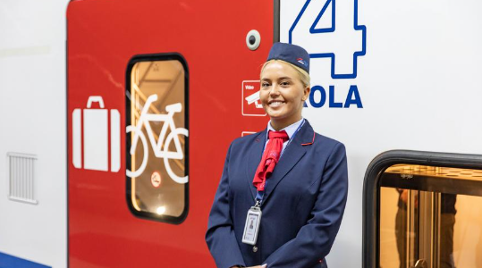 A conductors waits for passengers to board the train of theungary-Serbia high-speed railway, in Belgrade, Serbia, Oct. 3, 2025. (Photo by Wang Wei/Xinhua)