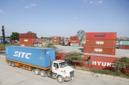 A lorry drives out of the Hong Leng Huor Dry Port on the western suburb of Phnom Penh, Cambodia on Jan. 13, 2022.(Photo by Phearum/Xinhua)