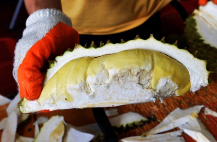 A worker shows the pulp of a durian in Bangkok, Thailand on June 1, 2022. Local durian farmers welcome a bumper harvest in Thailand. (Xinhua/Rachen Sageamsak)
