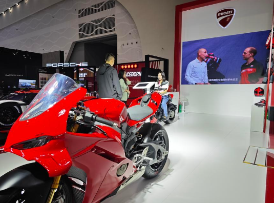Visitors view the Ducati motorcycles at the 5th China International Consumer Products Expo (CICPE) in Haikou, capital of south China's Hainan Province, April 14, 2025. (Xinhua/Zhou Huimin)