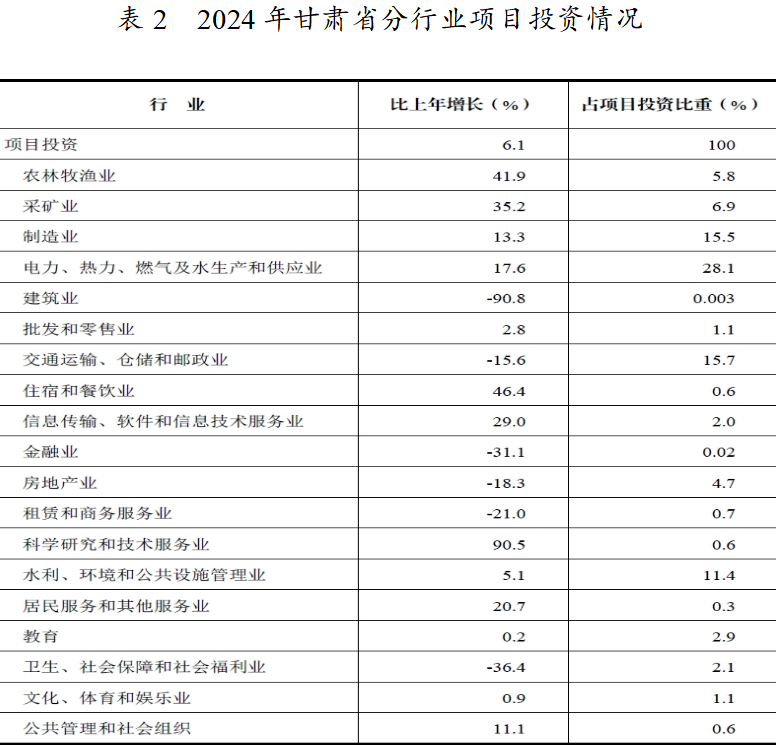 表2 2024年甘肃省分行业项目投资情况