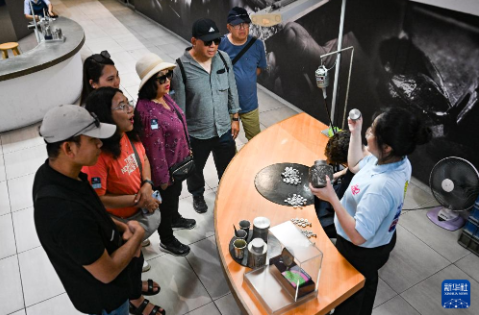 11月11日,在马来西亚首都吉隆坡的皇家雪兰莪锡镴访客中心,讲解员向游客们介绍锡制品制作工艺。新华社记者 程一恒 摄