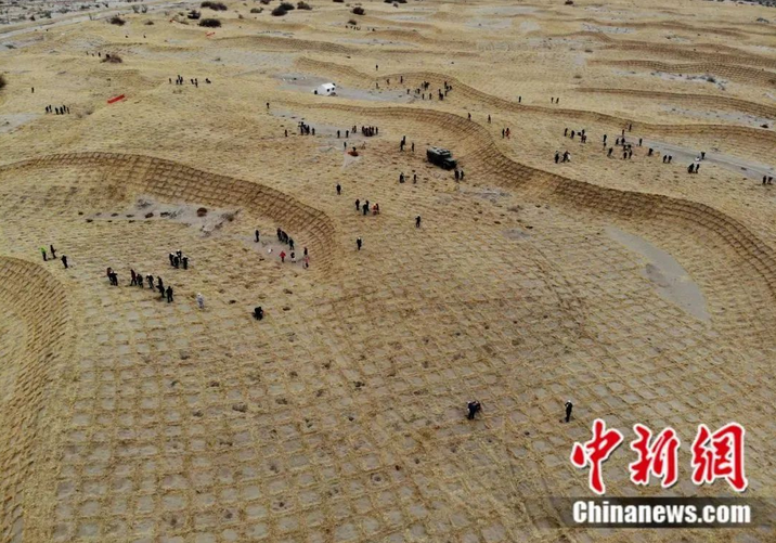 “草方格”上压沙植树。中新社记者 杨艳敏 摄