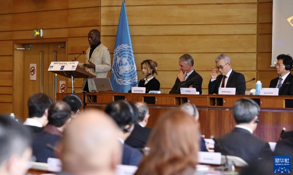 4月15日,在位于法国巴黎的联合国教科文组织总部,联合国教科文组织跨文化对话部门前主任杜杜·迪安(后左一)在“文明交流互鉴理念国际研讨会”上作主旨发言。新华社记者 高静 摄