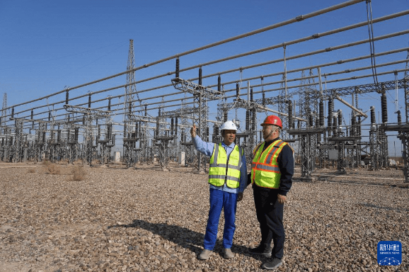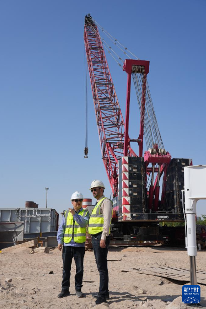 11月20日,在伊拉克纳杰夫省,纳杰夫燃机电厂联合循环扩建项目常务副经理高守江(左)和项目伊方业主纳西姆·阿亚德巡查工程进展。新华社记者 段敏夫 摄