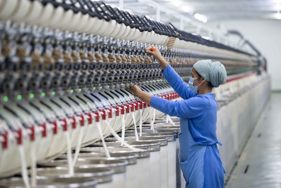一名中方员工在中塔合作项目丹加拉农业纺织产业园的纺纱二车间工作。