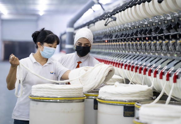 塔方员工在中塔合作项目丹加拉农业纺织产业园的纺纱二车间工作。