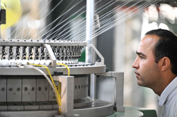 塔方员工古夫龙在中塔合作项目丹加拉农业纺织产业园的针织车间工作。