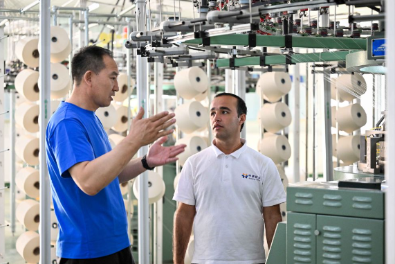 在中塔合作项目丹加拉农业纺织产业园的针织车间,中方员工指导塔方员工古夫龙(右)工作。