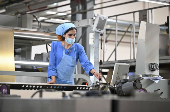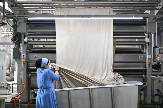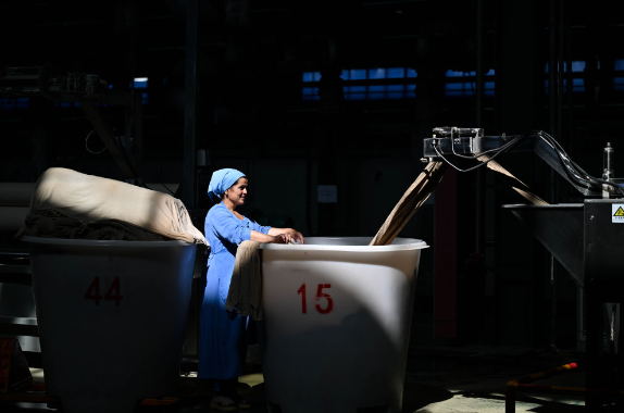 塔方员工在中塔合作项目丹加拉农业纺织产业园的印染车间工作。
