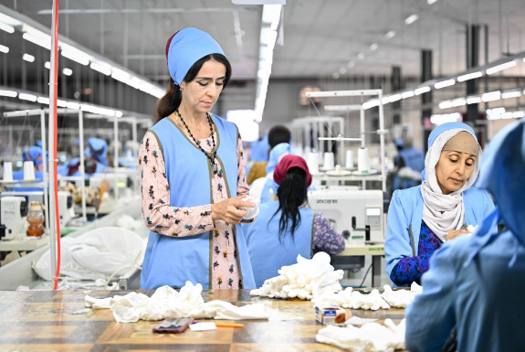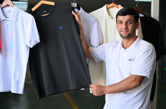 在塔吉克斯坦哈特隆州丹加拉区的中塔合作项目丹加拉农业纺织产业园,塔方员工卡尤莫夫展示成衣样品。