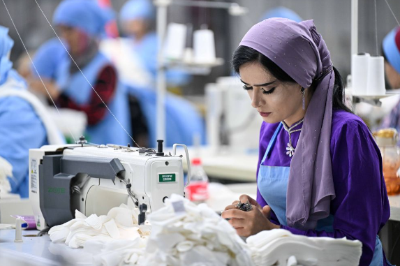 塔方员工在中塔合作项目丹加拉农业纺织产业园的成衣车间工作。