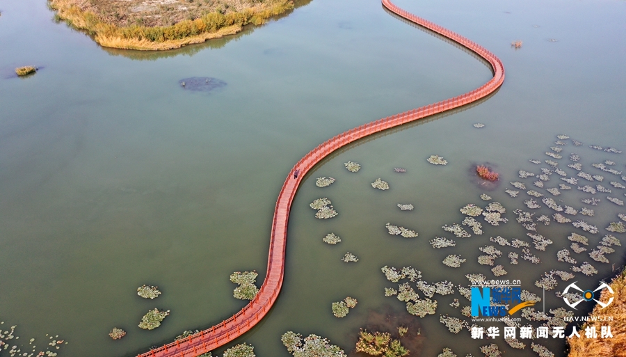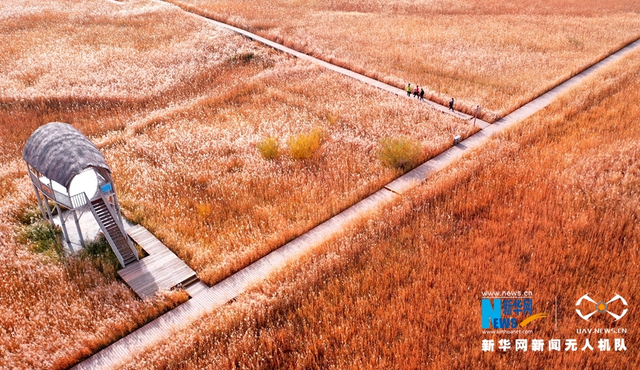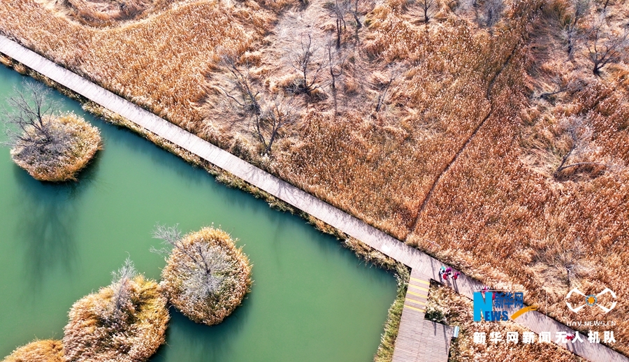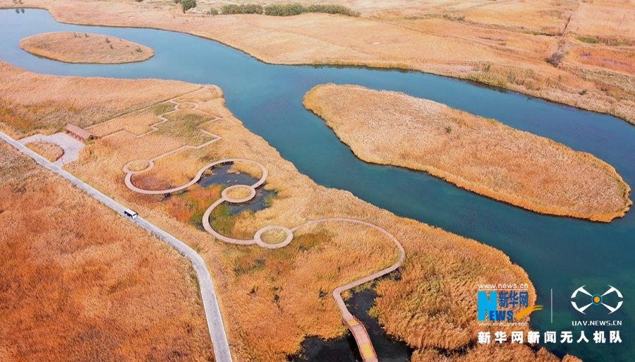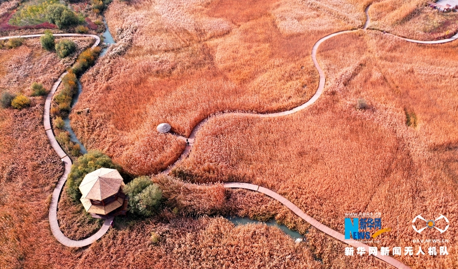 这是10月12日航拍的甘肃省张掖国家湿地公园芦苇荡。新华网发(杨永伟 摄)